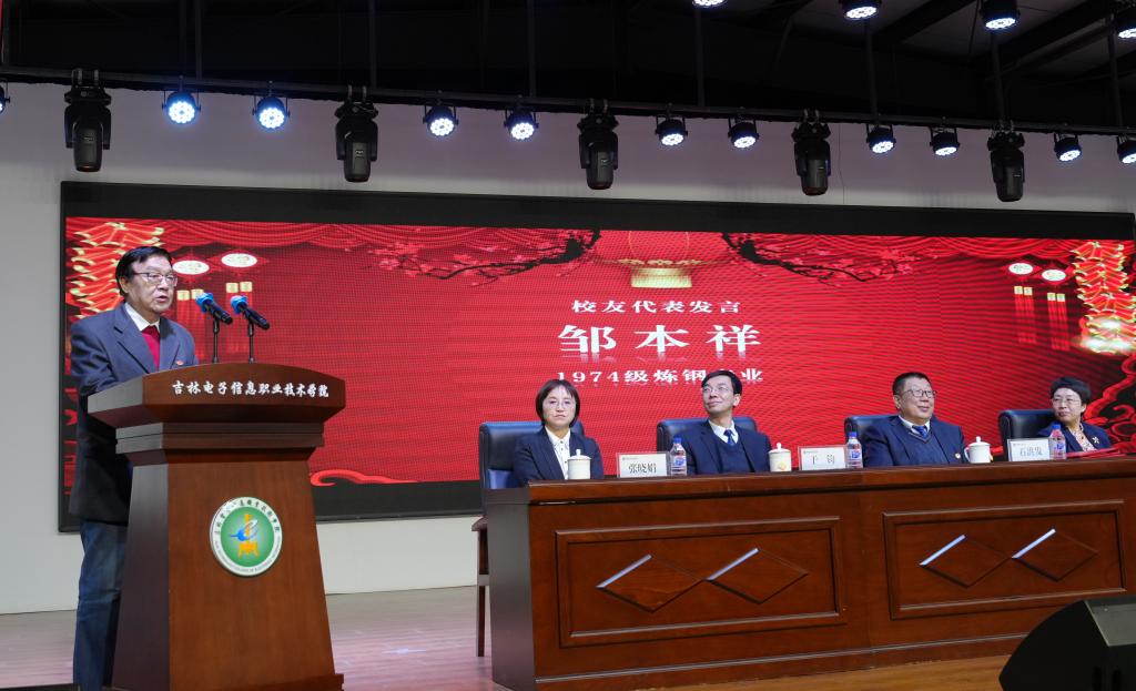 1974级炼钢专业邹本祥代表校友发言。他回顾母校光辉的发展历程,表示将全力发动广大校友,积极参与学校60周年校庆活动,为母校的发展贡献力量。
