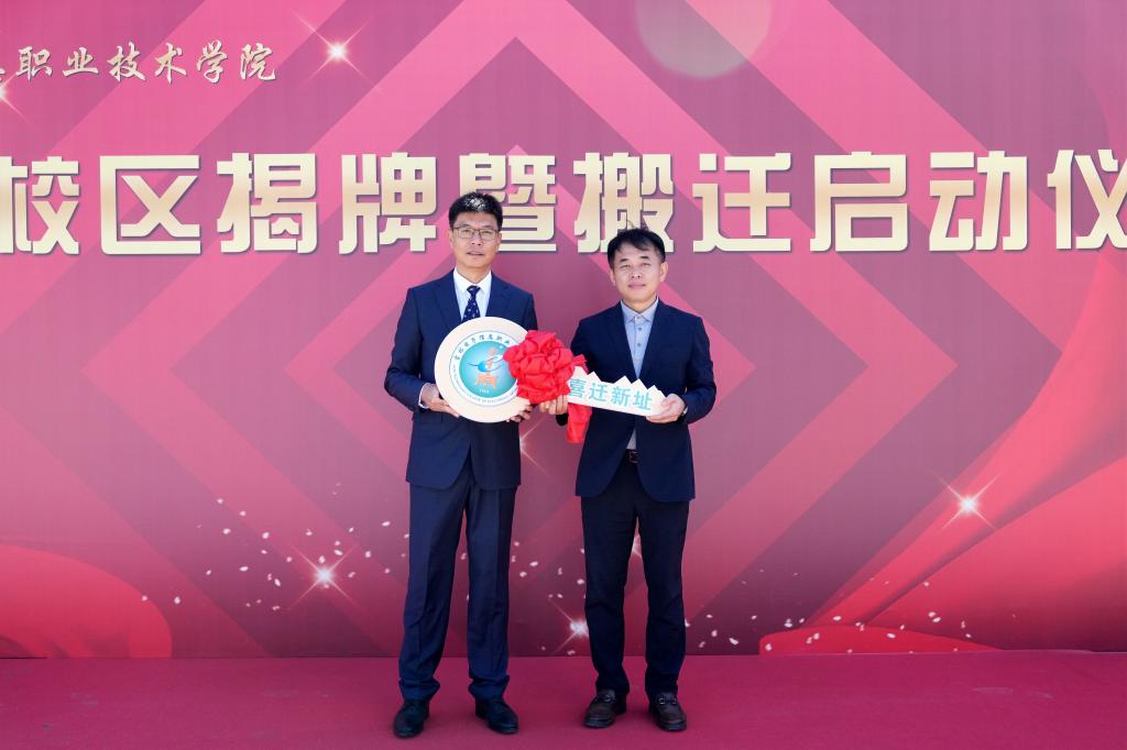 9月6日,学校举行新山校区揭牌暨搬迁启动仪式,学校领导班子全体成员及中层干部参加仪式,党委书记何晓杰、校长杨勇共同为新山校区揭牌。吉林省华兴工程建设集团有限公司总经理金仁鹤代表承建单位向校长杨勇交付“喜迁新址”钥匙。仪式由党委副书记石洪发主持。 党委书记何晓杰、校长杨勇共同为新山校区揭牌 华兴工程建设集团有限公司总经理金仁鹤代表承建单位向校长杨勇交付“喜迁新址”钥匙 党委副书记石洪发主持仪式 仪式结束后,在新校区明德广场举行了隆重的升旗仪式。入驻新山校区后,优美的校园环境、宽敞明亮的教室、设备齐全的实训室、舒适的学生公寓,为学生的学习和生活提供了全方位的支持,学生将享受到更加优质的教育资源。 升旗仪式现场 同时,新校区的建成和投入使用,在学校办学历程中具有里程碑意义,不仅极大改善了办学条件,拓宽了办学空间,也必将有力推动学校各项事业高质量发展再上新台阶。 新山校区图书馆 新山校区明德广场 (初审:孟令飞 复审:刘莹 终审:汤海涛)